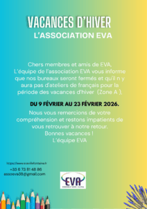 تیم EVA مایل است به شما اطلاع دهد که دفاتر ما در طول تعطیلات زمستانی (منطقه A)، از 9 فوریه تا 23 فوریه 2026، تعطیل خواهد بود و هیچ کارگاه فرانسوی برگزار نخواهد شد. از درک شما متشکریم و مشتاقانه منتظر دیدار مجدد شما پس از بازگشتمان هستیم.